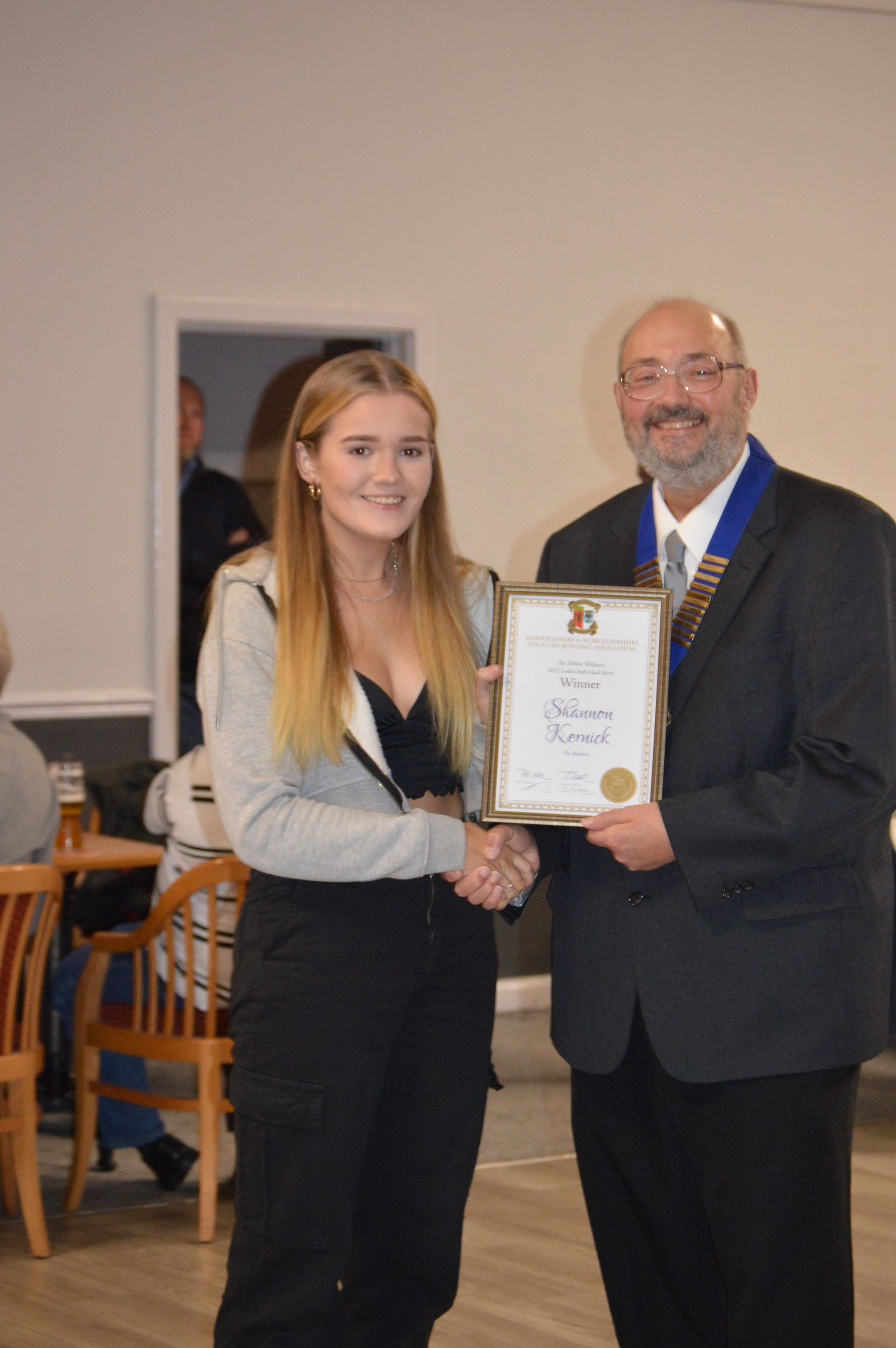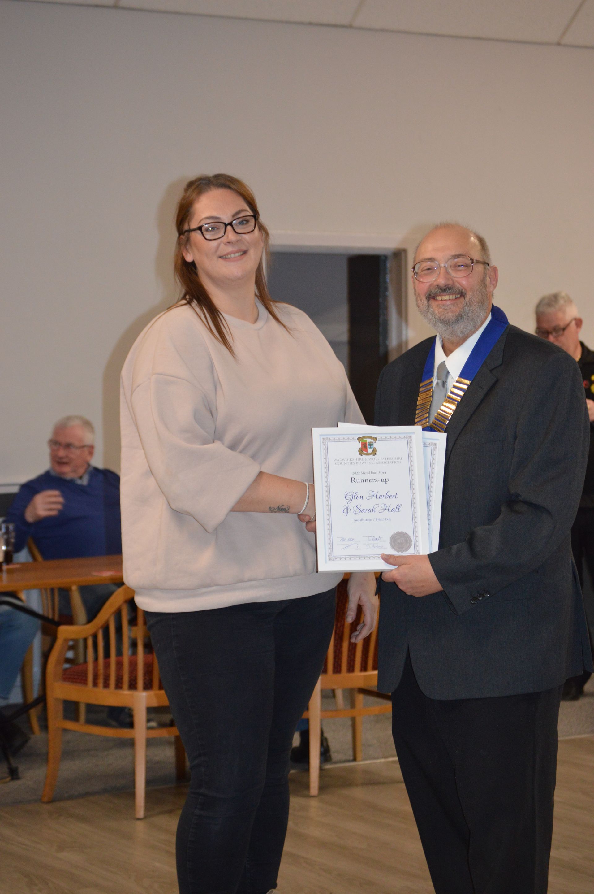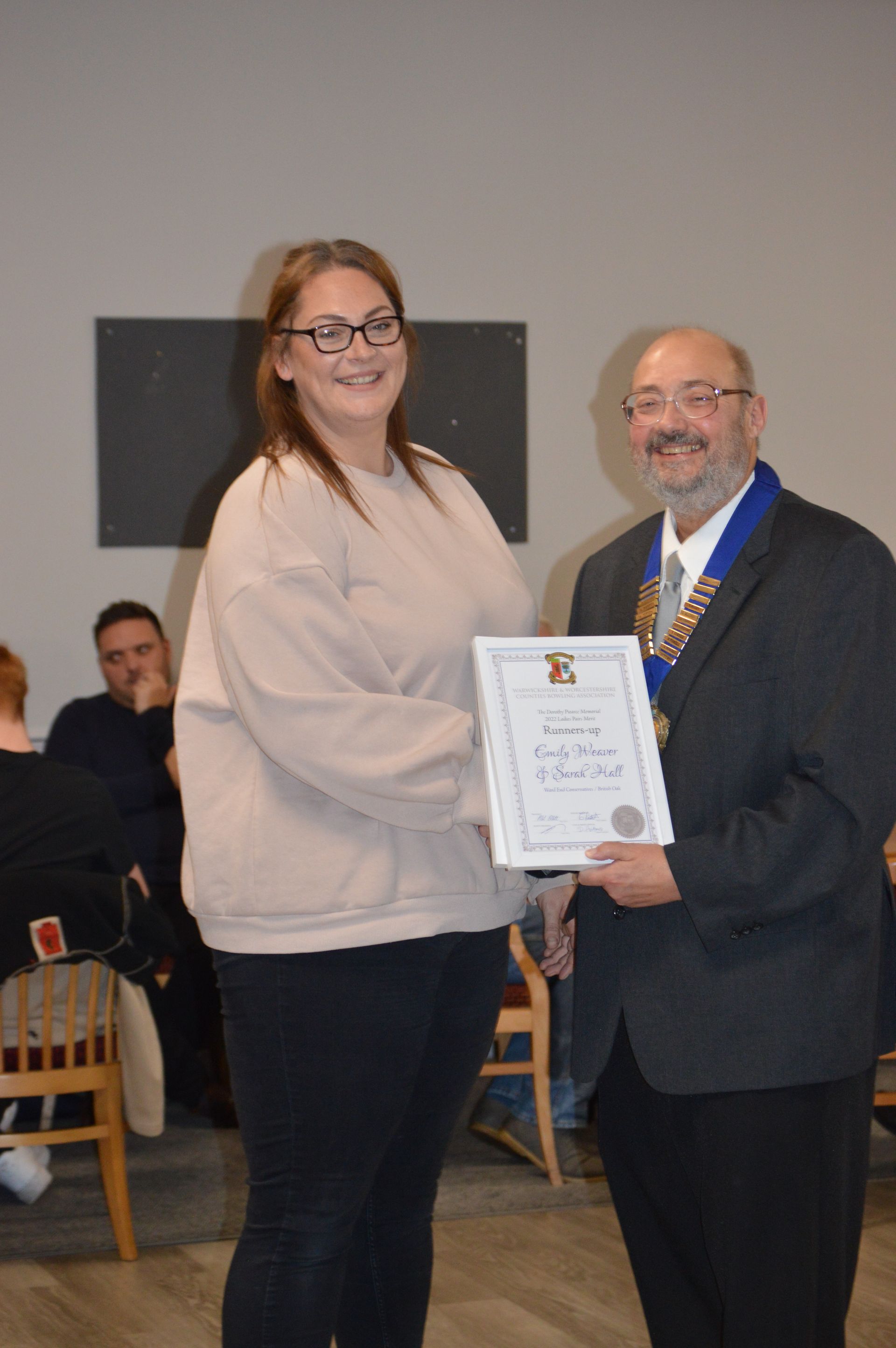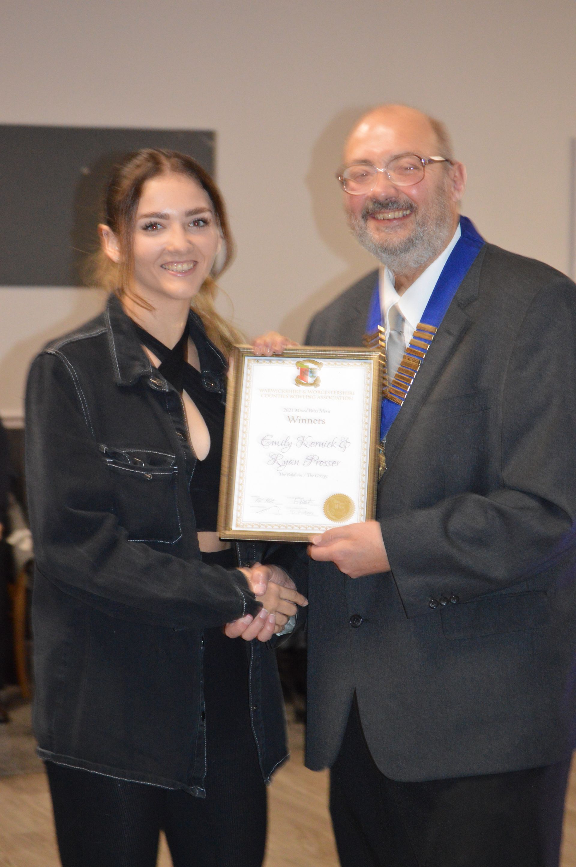 Collecting her Mixed Pairs Winners Certificate for the 2021 Season. Emily paired with Ryan Prosser.
